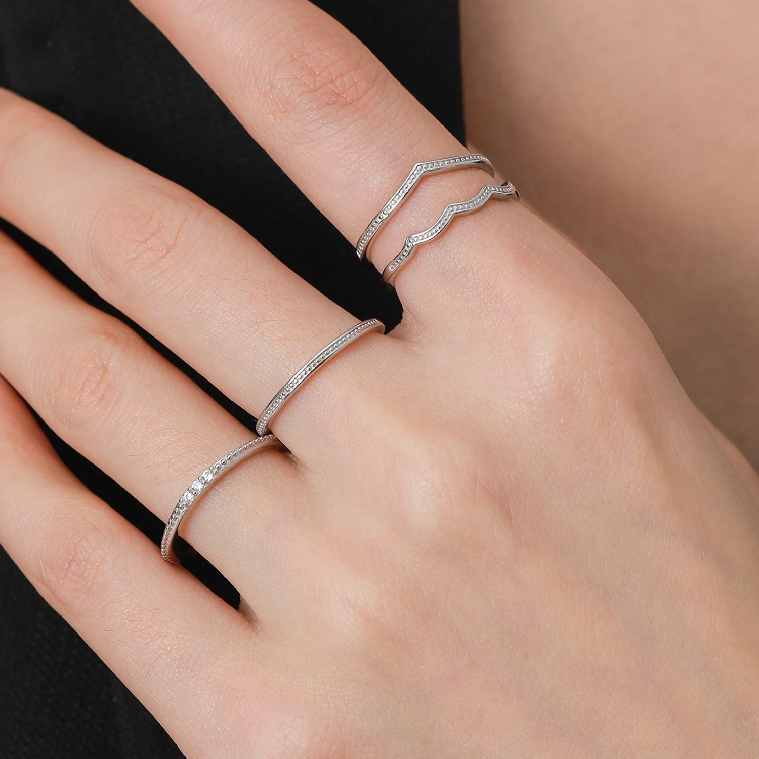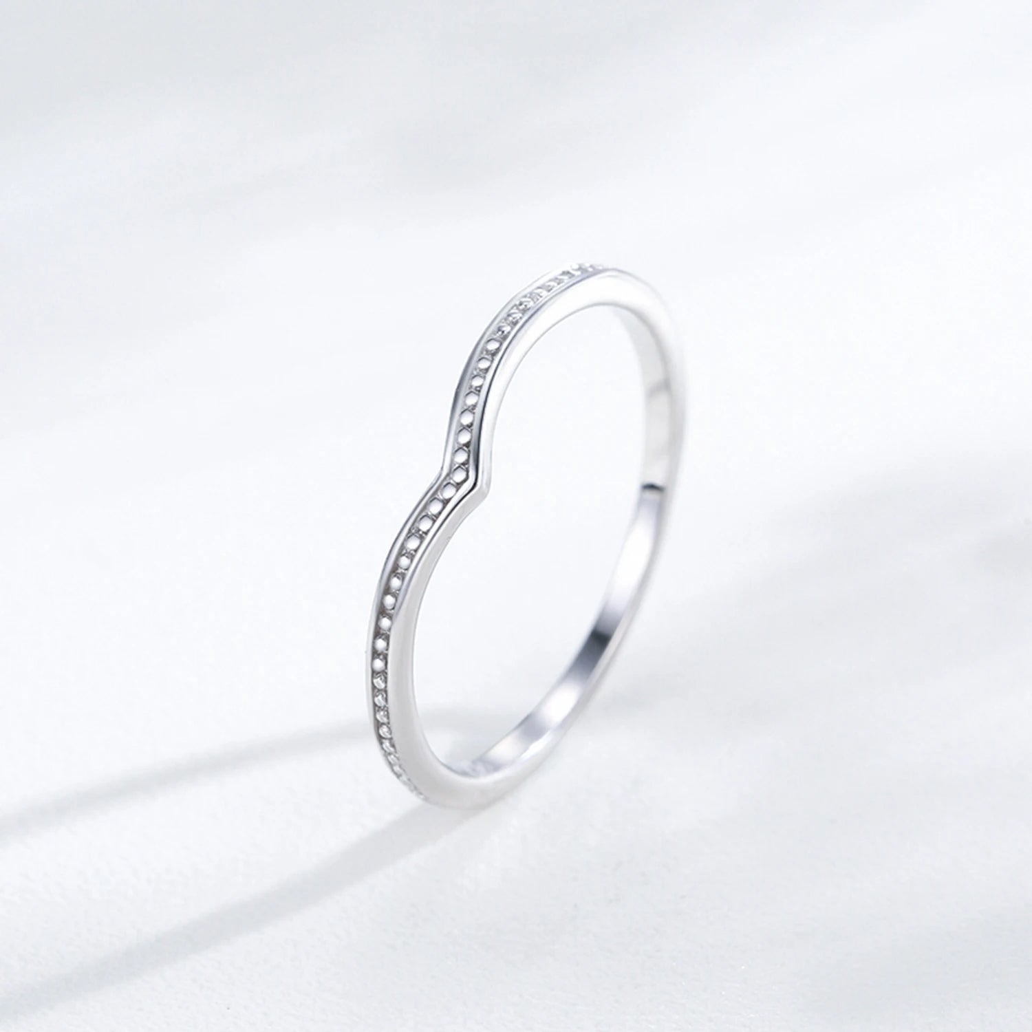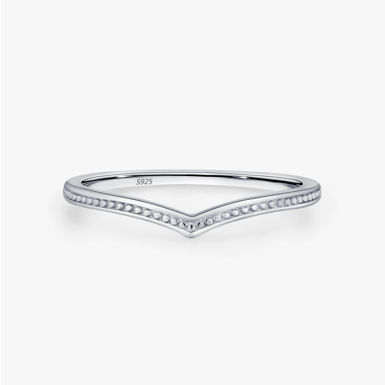 Ein feiner, V-förmiger Silberring, besetzt mit kleinen Diamanten, die wie ein Lichtstrahl vom Himmel herabfallen und mit endloser Eleganz strahlen.