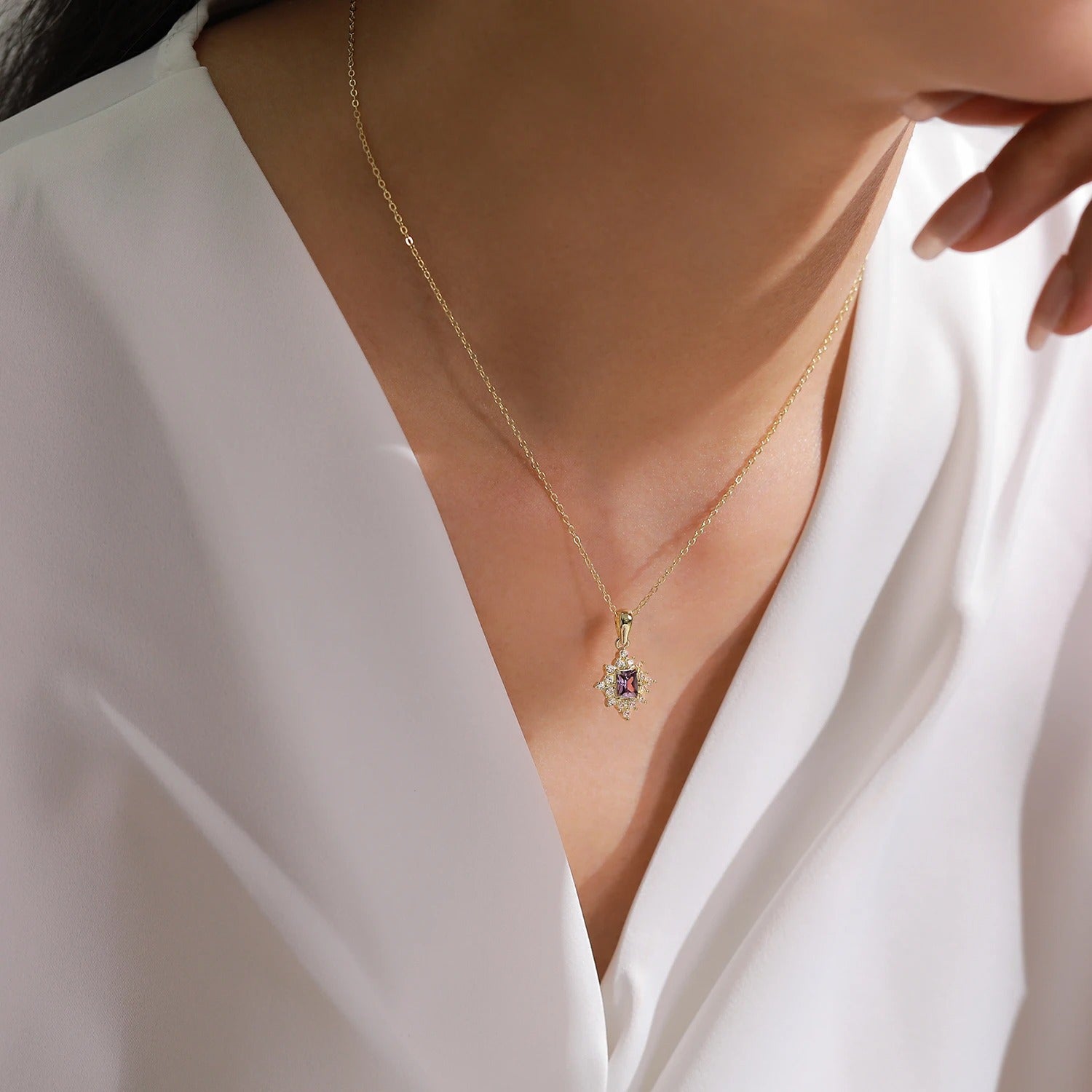 Une pierre violette rectangulaire sertie d’or en éclat d’étoile, parsemée de diamants comme un ciel traversé de lumière.