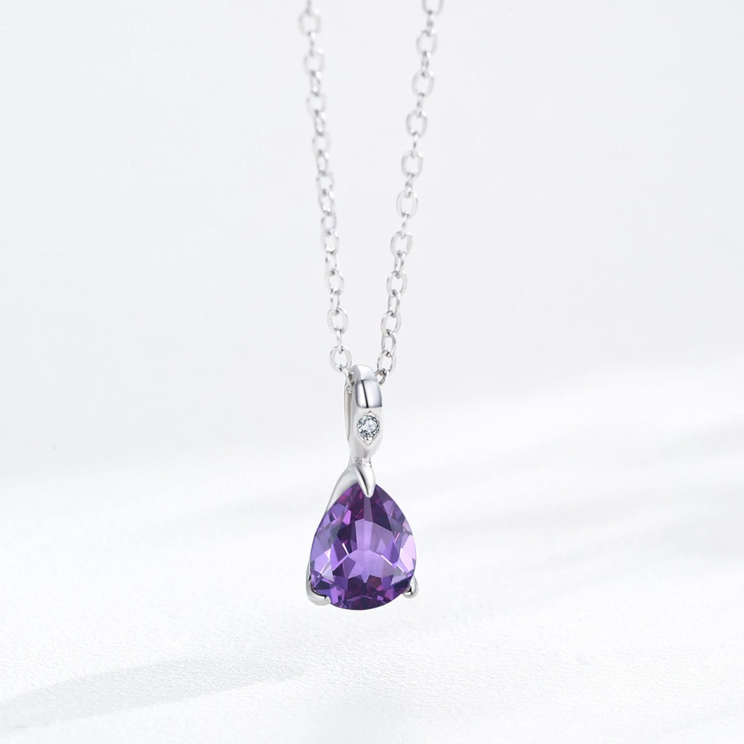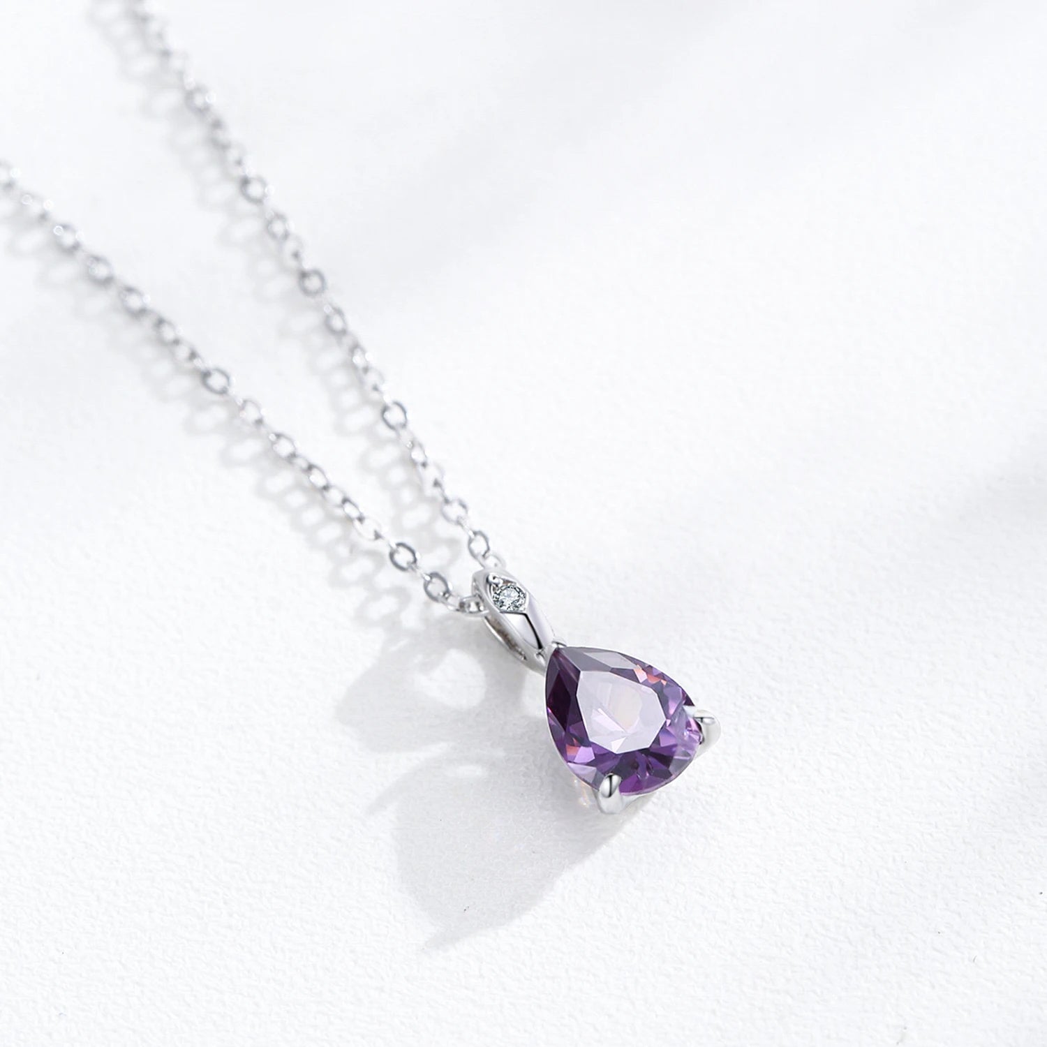 Un diamant violet foncé en forme de goutte, suspendu sur un collier argenté, comme une pluie légère tombant sur un ciel de pourpre, éblouissante et silencieuse.